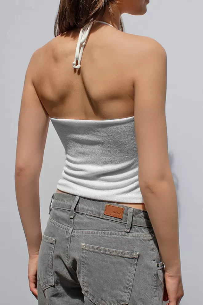 Top à col en V, sans manches, laçage au dos, longueur normal, coupe slim.