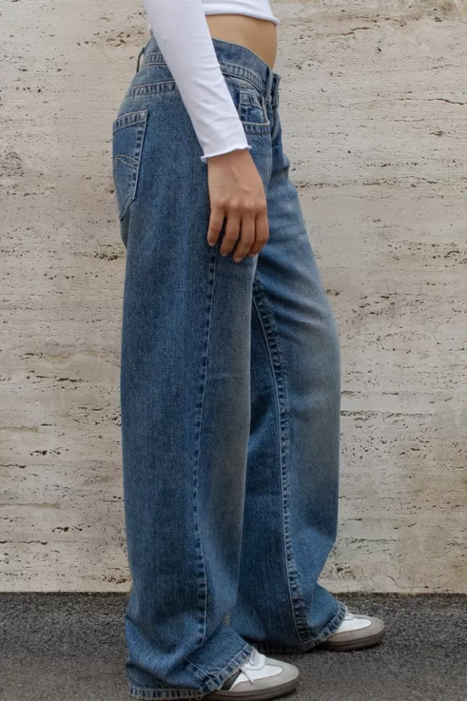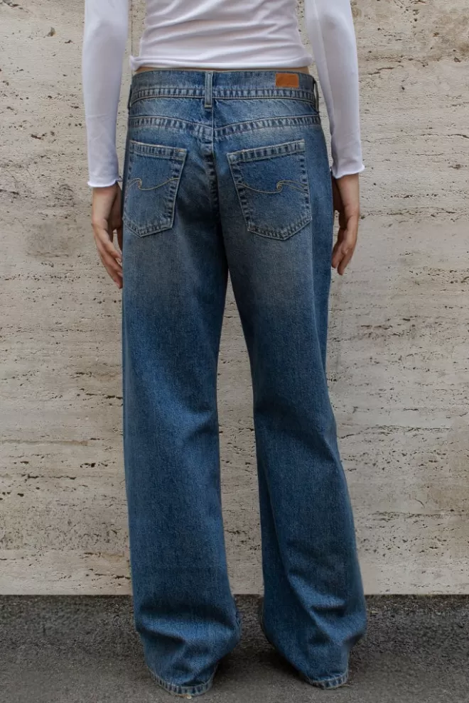 Jean wide leg, taille basse, fermeture avec bouton et éclair, détail avec broderie, au dos 4 poches, passants sur la taille, coupe confortable.