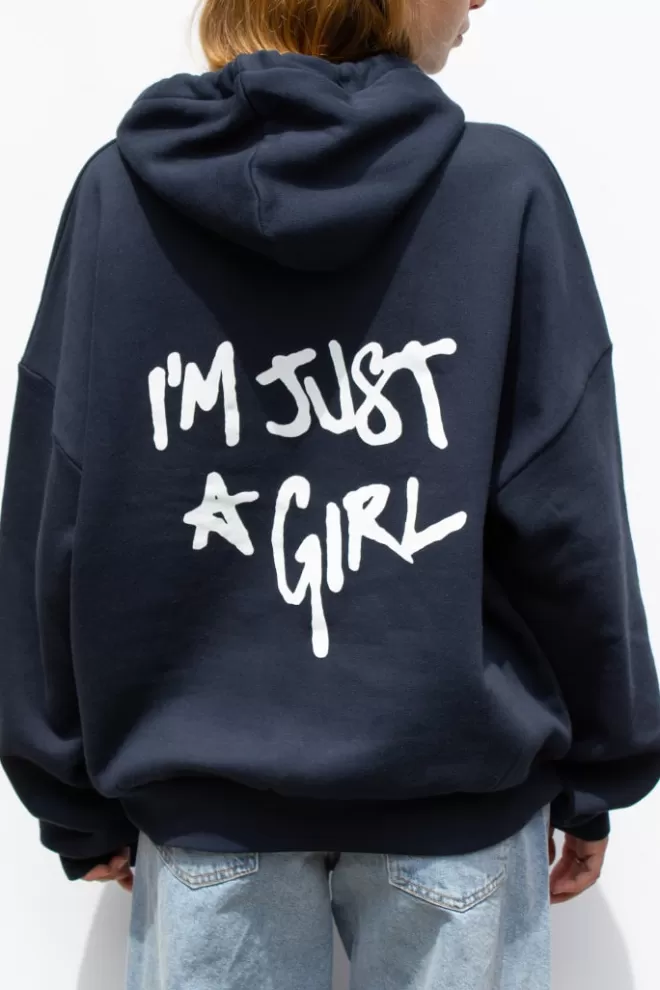 Sweat imprimé I’m just a girl, à capuche, poches frontales, manches longues, longueur longue, coupe décontractée.