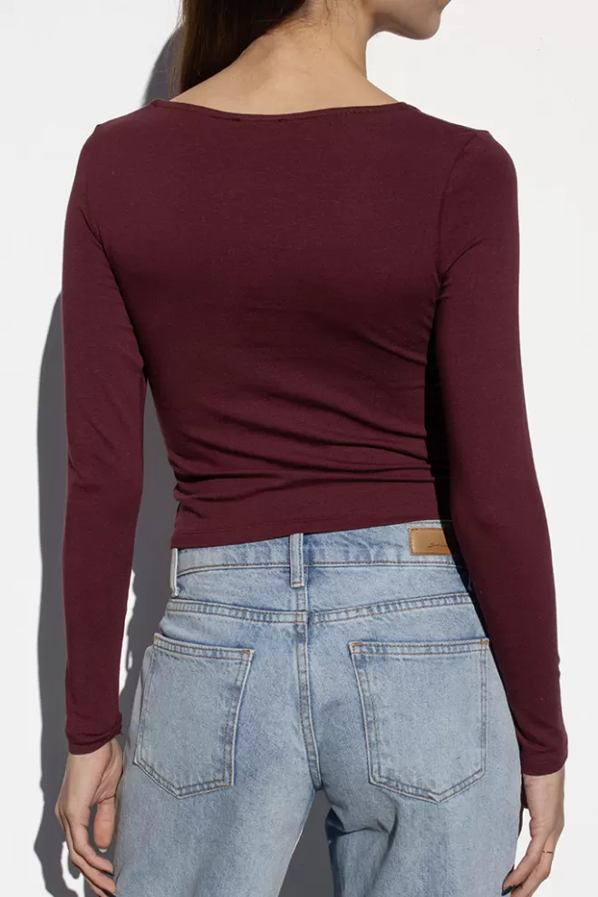 T-shirt avec un nœud sur le devant, décolleté en v, manches longues, longueur normale, coupe slim.